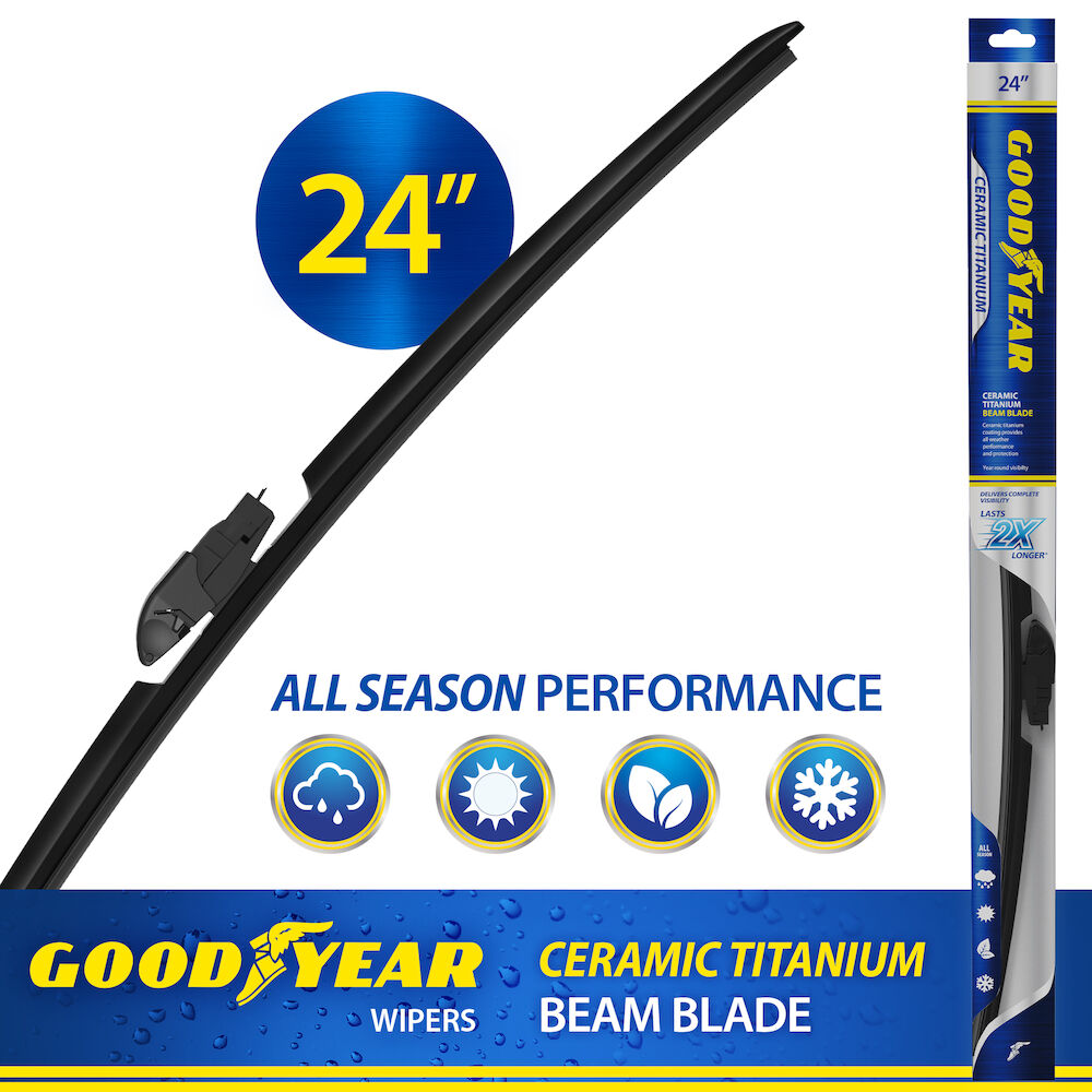 Where to BuyGoodyear Ceramic Titanium beam blades are engineered to last 2X longer* and provide year-round visibility. The blade’s Ceramic Titanium Dioxide coating reduces friction for a smooth quiet wipe, while protecting the wiping element from damage. Installation is quick and easy as these wiper blades are equipped with a universal adapter system to fit most wiper arm styles. So, treat your vehicle to all season performance with Goodyear Ceramic Titanium wiper blades. Blades are available in 13” to 28” lengths.