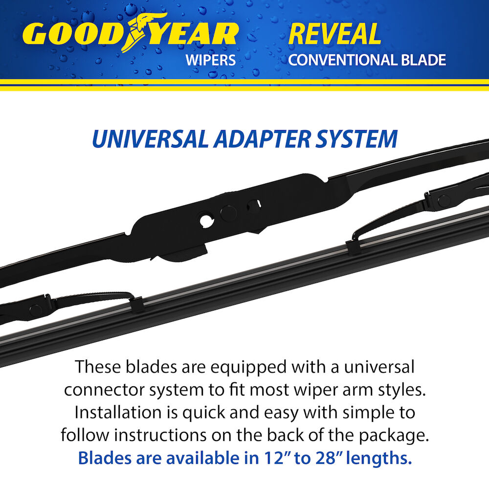 Where to BuyGoodyear Reveal wiper blades are constructed with a rust-resistant steel frame to ensure durability over the lifetime of the blade. These conventional blades deliver reliable performance and provide a clean, smooth wipe. Installation is quick and easy with the detailed instructions printed right on the package. Get clear vison with Goodyear Reveal wiper blades. Blades are available in 12” to 28” lengths.
